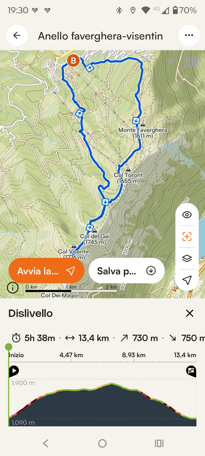Partenza dal piazzale del Nevegal risalendo lungo la vecchia pista Faverghera. Giunti all'altezza del ristorante "La Casera", si svuota a destra verso il giardino botanico, proseguendo fino alla stazione d’arrivo della seggiovia "La Coca". Da qui, l'itinerario continua verso il rifugio Brisot e successivamente fino alla cima del monte Visentin. Per il rientro, si percorre il sentiero a ritroso fino al bivio che conduce, in successione, ai rifugi Toront e Grava, per poi fare ritorno definitivo al parcheggio.